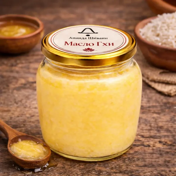 Масло гхи — это очищенное сливочное масло с мягким ореховым вкусом и насыщенным ароматом, приготовленное вручную в центре медитации. Оно не содержит лишней влаги и примесей, хорошо усваивается и подходит для жарки, приготовления блюд и повседневного использования. Гхи придаёт еде глубину вкуса и считается ценным продуктом в традиционной кухне и аюрведе.